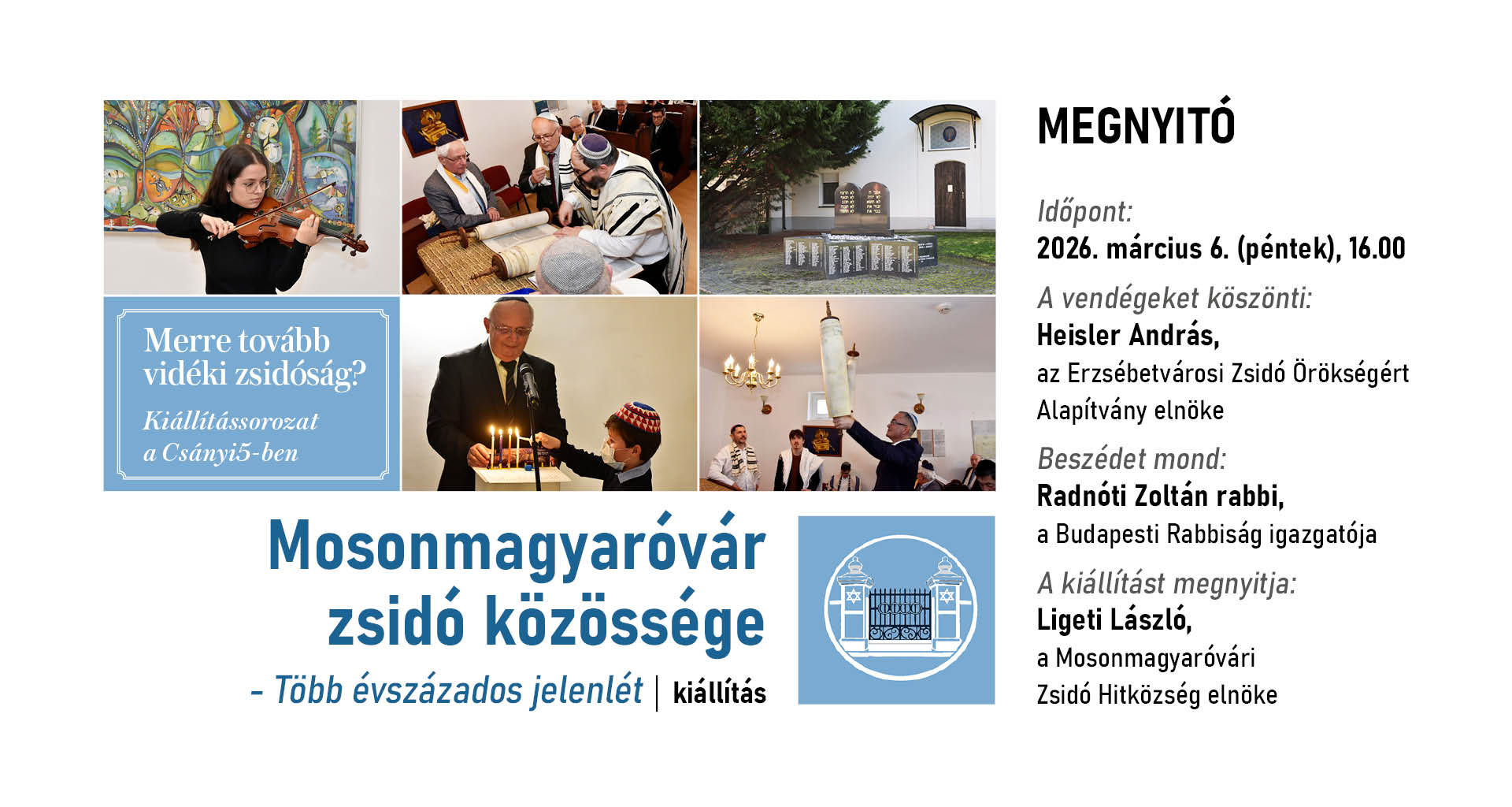 Erre az emlékképre alapozva indítunk útjára egy kiállítás-sorozatot a Csányi5-ben, ami a fővárosi zsidóság vidéki gyökereit kívánja bemutatni. Elsőként a Mosonmagyaróvári Zsidó Hitközség mutatkozik be a Csányi5 Galériájában. Egy apró közösség, amelyik a zsidó kultúrán keresztül megkísérli megőrizni őseik hagyatékát, s ahonnan mára az összes mosoni zsidó fiatal már Budapestre költözött.